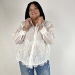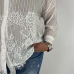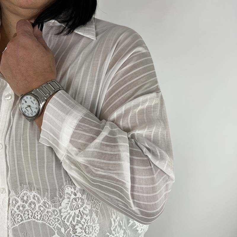 Camicia in puro cotone bianco, impreziosita da un raffinato inserto di pizzo sulla parte inferiore. Il gioco di trasparenze delle righe aggiunge un tocco sofisticato e contemporaneo, trasformando un capo essenziale in un dettaglio di stile. Morbida, fresca e versatile, è perfetta per completare look sia casual chic che più eleganti, mantenendo sempre un’allure ricercata.