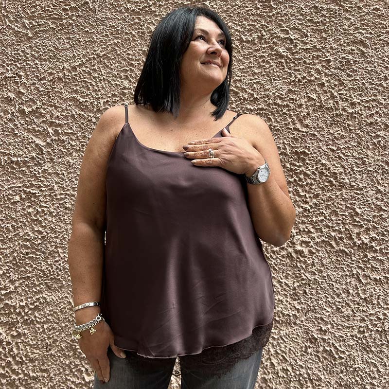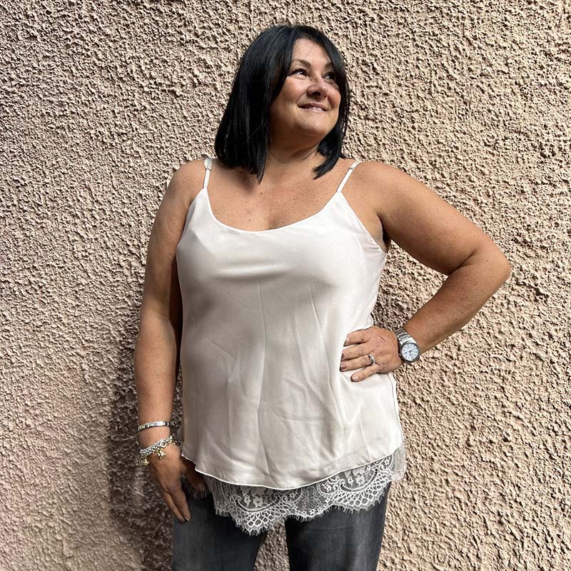 Scopri la canotta curvy che unisce eleganza e comfort in un unico capo versatile! Realizzata con un raffinato pizzo sul fondo in tessuto doppio, questa canotta รจ pensata per esaltare le tue curve in modo delicato e sofisticato. Le spalline regolabili ti permetteranno di ottenere la vestibilitร perfetta adattandosi splendidamente alla tua silhouette.