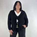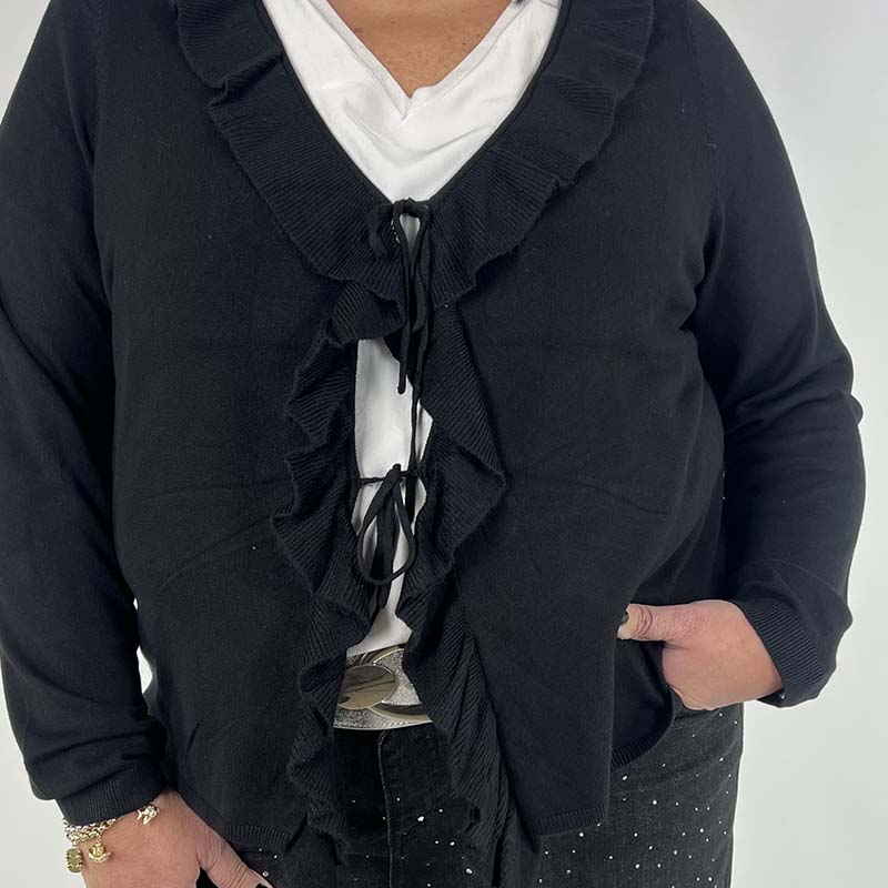 Cardigan corto fino ai fianchi, dal design delicato e romantico. Il davanti è arricchito da morbide rouches che donano movimento e un tocco raffinato al capo. La chiusura con laccetti regolabili permette di adattare la vestibilità, valorizzando la silhouette con eleganza. Perfetto da abbinare a top o abiti, è ideale per completare look sia casual che più ricercati.