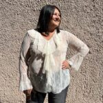 Casacca in pizzo di tulle, romantica e leggera, con rouches sul davanti. Le maniche larghe cadono morbide e l’elastico sul fondo crea una delicata balzettina. Lo scavo a V e la rouches che accompagna lo scavo, creando in fondo una specie di cravattino, rendono questa casacca femminile e particolare. Perfetta da abbinare a jeans per un look daily chic o a una gonna per un outfit romantico ma immediato.