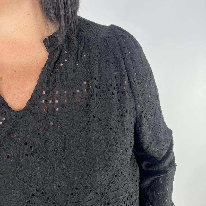 Questa casacca in sangallo è un piccolo capolavoro di eleganza contemporanea, pensata per chi ama distinguersi con stile ma senza eccessi. Realizzata in un delicato sangallo, leggero e trasparente crea un effetto sofisticato e mai scontato. Indossata da sola, con un body, diventa protagonista assoluta di un look da sera: prova ad abbinarla a un pantalone palazzo  nero o a una gonna midi in pelle per un mix riuscitissimo tra femminilità e carattere.
