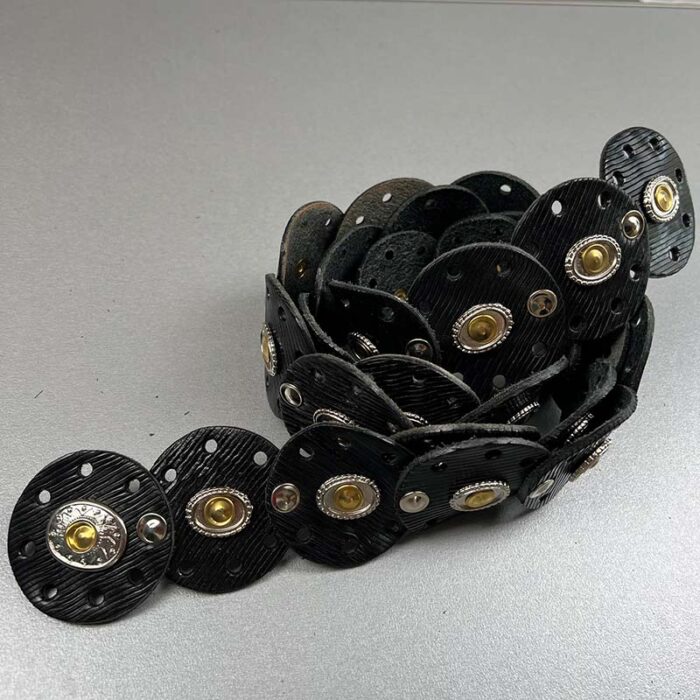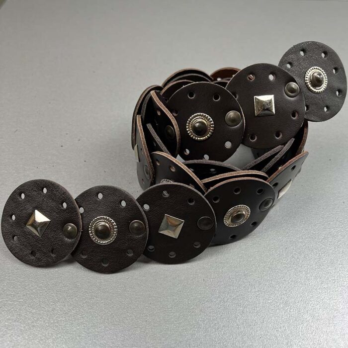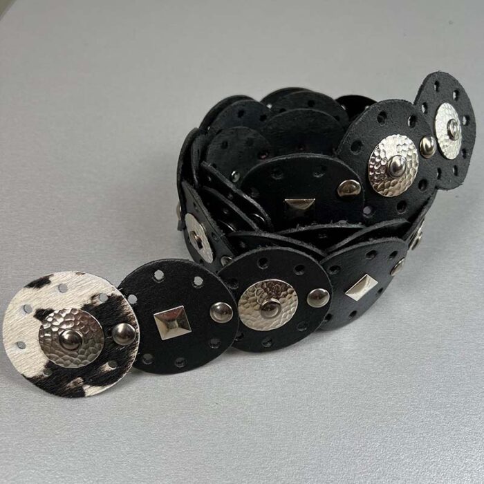 Cintura in pelle fatta a mano, con dischi in pelle e borchie metalliche: unisce artigianato tradizionale a un look audace, per uno stile rilassato ma decisamente definito. Ogni cintura è realizzata a mano con pelle scelta e cura, formando eleganti dischi che dialogano con borchie metalliche. Le superfici noleggiate, lucide o leggermente satinate, conferiscono profondità e movimento al pezzo. La cintura combina robustezza e dettaglio: una lavorazione artigianale che valorizza ogni curva, ideale per completare look rock, casual o boho-chic. Disponibile in diverse misure, con chiusura sicura e rifiniture curate al dettaglio.