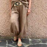 Abbina il pantalone con una semplice maglietta bianca o una camicia leggera in cotone, e completa con scarpe basse o sandali eleganti. Perfetta per un brunch o un pomeriggio di shopping.