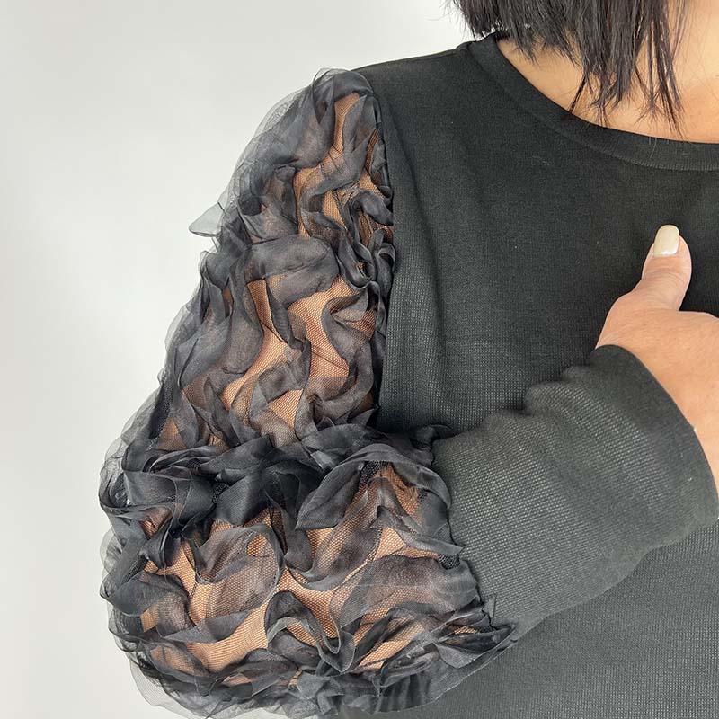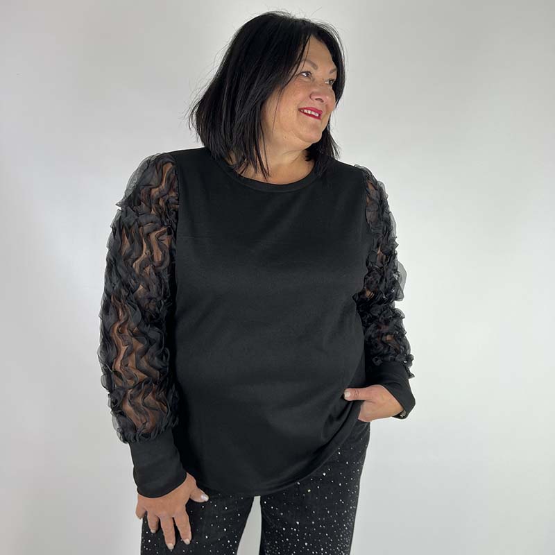 Un gioco di dettagli che fa la differenza. La felpa girocollo basico si arricchisce di maniche a palloncino in tulle con frappe che rendono questa felpa particolare dai dettagli ricercati. Un capo versatile e sofisticato, perfetto per chi ama i look sporty chic: indossalo con jeans e sneakers per un mood casual raffinato, o con pantaloni sartoriali e stivaletti per un effetto più elegante.