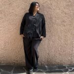 A completare la collezione, il pantalone a palazzo con fusciacca tono su tono, simbolo di fluiditร  e ricercatezza contemporanea.