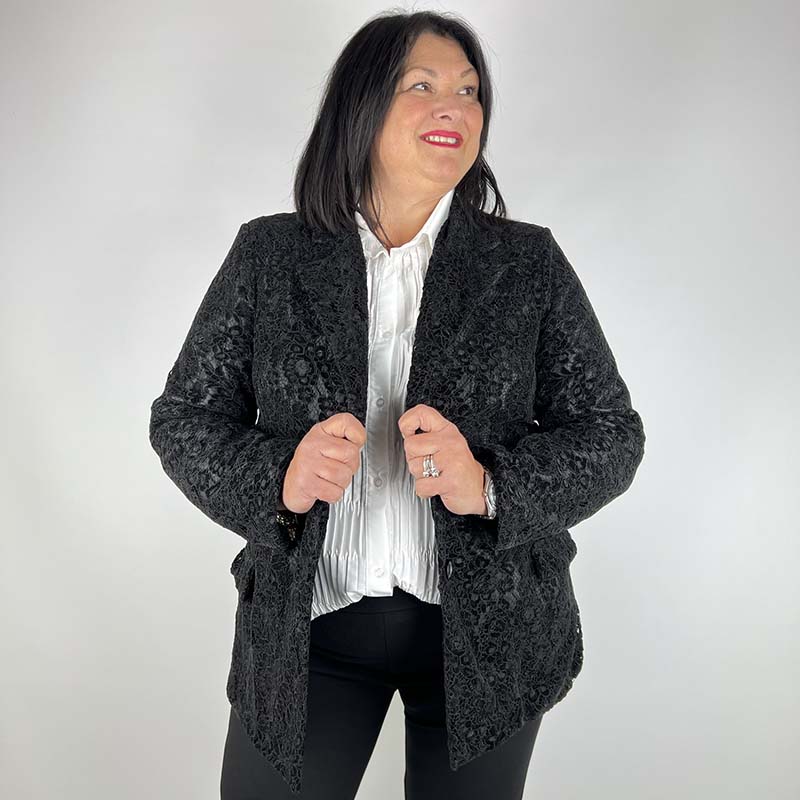 Una giacca strutturata in pregiato pizzo di vellutino, pensata per chi ama distinguersi con eleganza. La lavorazione ricca di dettagli crea un raffinato gioco di texture, mentre la struttura definita valorizza la silhouette con classe. Sofisticata e particolare, è il capo ideale per aggiungere un tocco di charme a look serali o cerimonie, mantenendo sempre un’eleganza senza tempo.