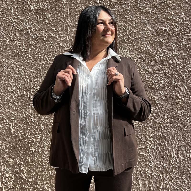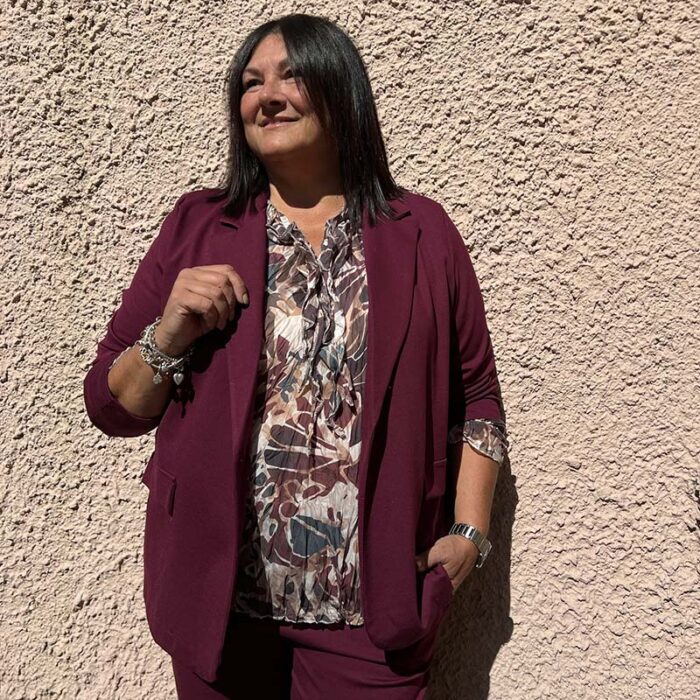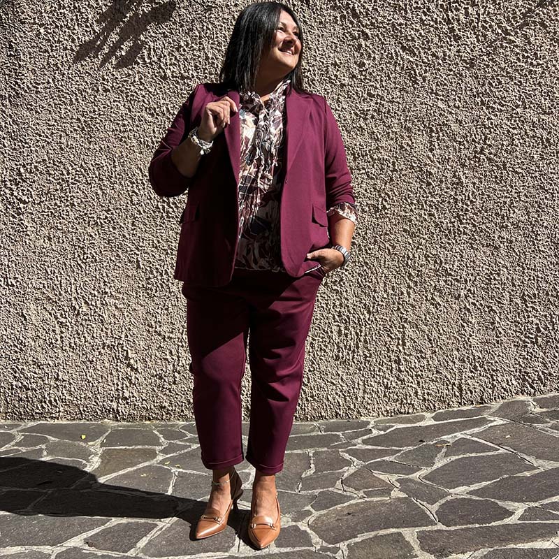 • La giacca strutturata con spalline che delinea la silhouette senza appesantire creando un look elegante, sofisticato e femminile.