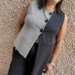 Scopri il fascino sofisticato di questo gilet autunnale, un capo che unisce stile e funzionalitร con un tocco di originalitร . Realizzato in doppio tessuto, il design si distingue per il contrasto tra le due parti: una parte in nero, elegante e versatile, che si estende fino ai fianchi offrendo un look slanciato e raffinato, e una parte piรน corta, decorata con una fantasia rigata nero e bianco, che aggiunge un tocco di vivacitร e modernitร al capo.
