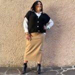 • Layering elegante: Gilet sopra un abito a maglia midi + cintura in vita + stivali alti.