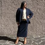 Per un outfit elegante, scegli una camicia di seta bianca, un blazer strutturato e décolleté neutri, con una clutch discreta per un tocco sofisticato ma sobrio.
