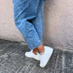 – Abbina il jeans carrot con una T-shirt bianca oversize effetto stropicciato e una giacca di jeans leggermente sfiancata. Completa il look con un paio di sneakers bianche e una borsa crossbody.