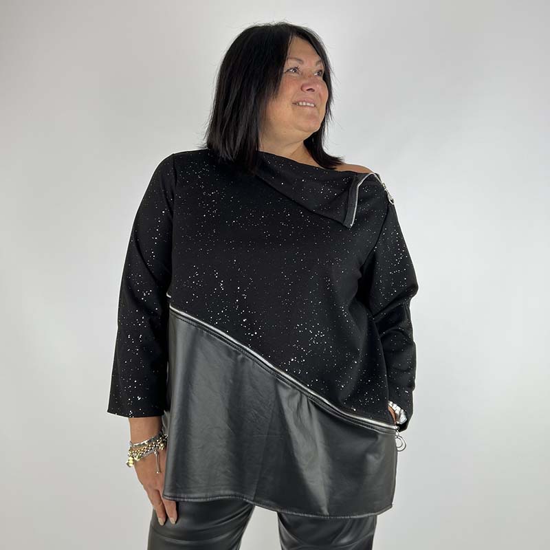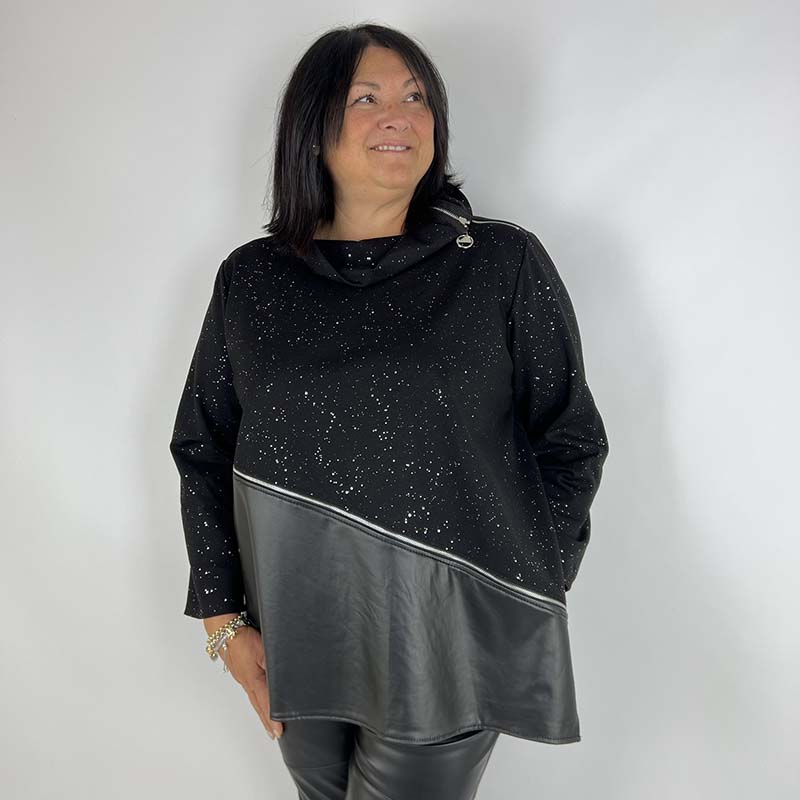 Grintosa e raffinata, il maglia Curvy con collo ad anello e dettagli ecopelle e cerinere decorative è pensato per valorizzare le forme con comfort e stile. Realizzato in un tessuto morbido ma sostenuto, offre una vestibilità fluida che accarezza la silhouette senza segnare. I dettagli creando movimento, donando un tocco di luminosità grintosa ma sofisticata, perfetta per illuminare il look in ogni occasione. Un capo versatile, ideale sia per il giorno che per la sera, capace di unire semplicità e femminilità con un’eleganza naturale.