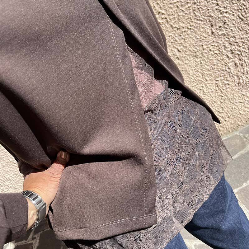 Romantica, raffinata, ma con un tocco inaspettato: questa maglia con inserto in pizzo รจ il perfetto equilibrio tra femminilitร e modernitร . Realizzata in un morbido tessuto fluido, la maglia presenta un taglio pulito e minimal sul davanti, mentre รจ sul retro che rivela la sua vera anima: uno spacco centrale sulla schiena si apre delicatamente per lasciare intravedere un prezioso pannello in pizzo lavorato, che sboccia come un dettaglio sartoriale, creando movimento e un raffinato gioco di trasparenze.ย Il pizzo prosegue anche sul fondo della maglia, aggiungendo un tocco romantico e sofisticato che trasforma anche lโoutfit piรน semplice in una dichiarazione di stile.ย Questa maglia รจ pensata per la donna che ama stupire con eleganza, per chi non ha paura di mostrare la propria femminilitร con gusto e misura.