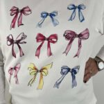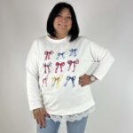 Maxi felpa dal design femminile e ricercato, caratterizzata da una vestibilità ampia e confortevole. Il fondo è impreziosito da un delicato pizzo raffinato che aggiunge un tocco romantico e sofisticato. La stampa di fiocchi decorati con strass luminosi dona brillantezza e un effetto glamour, rendendo il capo perfetto per chi ama distinguersi anche nei look casual. Ideale da indossare con leggings o jeans per un outfit comodo ma di grande stile.