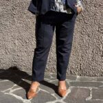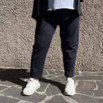 • Il pantalone con cuciture al ginocchio gioca con i volumi: leggermente ampio ma con fondo che si stringe, per unโ€™allure dinamica e moderna.