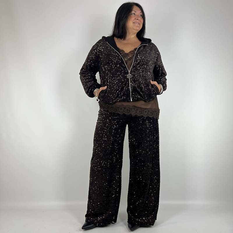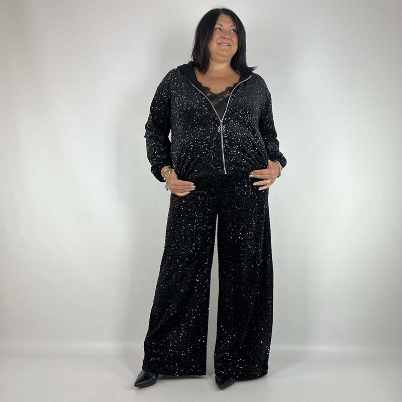 Comodo, moderno, e con quel tocco di eleganza che non passa inosservato. Il nostro pantalone a palazzo con pailettes รจ il mix perfetto tra stile e comfort: il taglio a palazzo semplice e minimal e le paillettes lo rendono particolare.