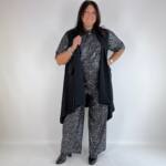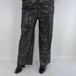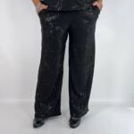 Scivola nel fascino della notte con il nostro incantevole pantalone curvy a palazzo, splendidamente tempestato di paillettes che catturano la luce ad ogni movimento. Questo pantalone รจ progettato per esaltare le curve in modo armonioso, offrendo una vestibilitร comoda senza rinunciare allo stile. La vita alta offre un effetto snellente, mentre la silhouette ampia scende morbida e fluida, aggiungendo eleganza a qualsiasi look.ย Le paillettes, che adornano l’intera superficie del pantalone, creano un gioco di luci e riflessi che rende questo capo perfetto per occasioni speciali, feste o serate in cittร . Il tessuto, leggero e leggermente elastico, consente una libertร di movimento che soddisfa le esigenze di una vita dinamica e vivace.