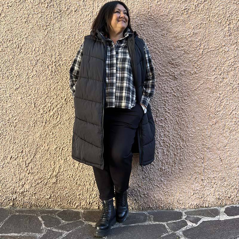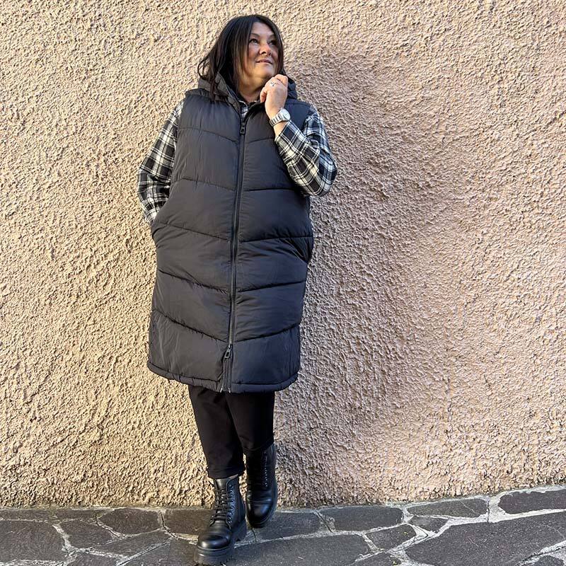 Piumino smanicato curvy con cappuccio fisso, pensato per valorizzare la silhouette senza rinunciare al comfort. La linea leggermente svasata accompagna le forme con naturalezza, mentre la zip frontale con doppio cursore garantisce praticitร e libertร di movimento. Leggero ma caldo, รจ perfetto per la mezza stagione o come strato extra nei mesi piรน freddi. Le tasche laterali completano il look con funzionalitร discreta.