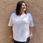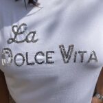La scritta in paillettes luccicanti, aggiunge un tocco di luminosità e originalità, rendendo ogni outfit unico. La sua linea stondata e svasata sul fondo slancia la figura. Perfetta per essere indossata in qualsiasi occasione, dalla passeggiata nel parco a un brunch con le amiche, questa maglietta è un vero must-have della stagione.